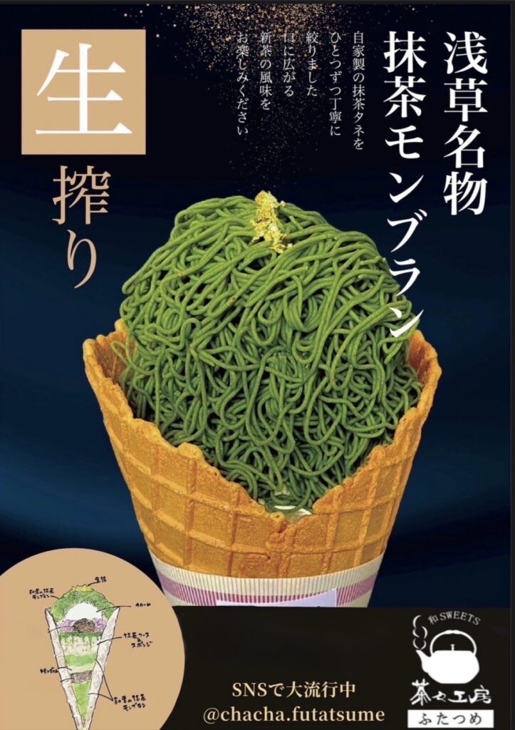 生搾り抹茶モンブラン、抹茶オレを中心に花やしき店だけの食べ歩きできる軽食などをご用意しております。